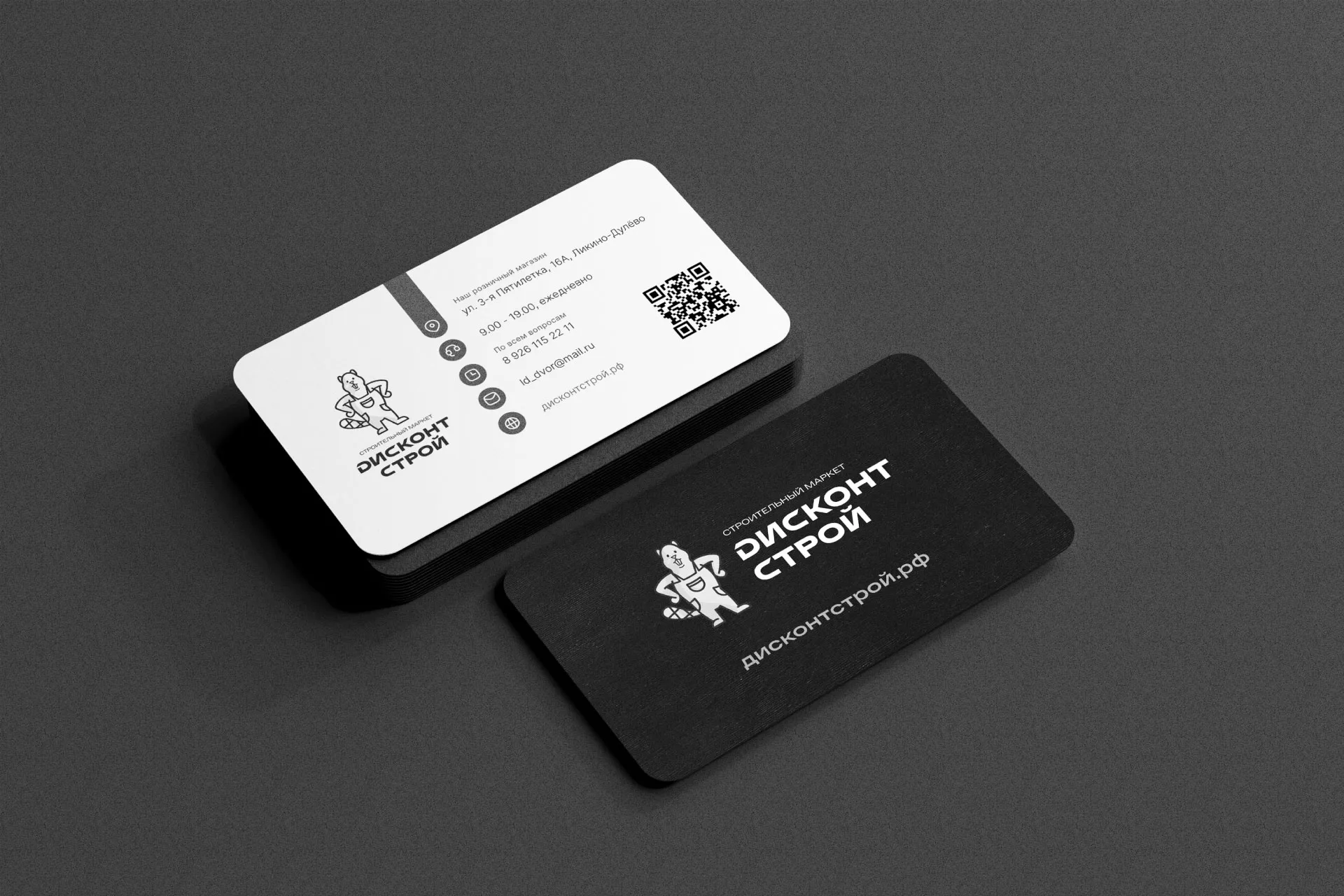 Вместе с логотипом, мы предложили заказчику сразу визуализацию логотипа в возможном дизайне на фирменный визитках магазина «Дисконт Строй» в Туране.